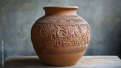 Beautifully sculpted traditional clay jar with ornate designs, representing the craftsmanship of handmade ceramics