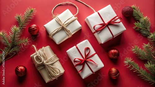 Beautifully Wrapped Gifts Adorned with Festive Red Ornaments and Evergreen Branches on a Vibrant Red Background