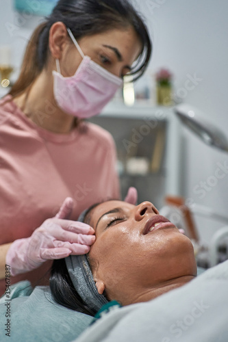 Beauty face skin care. Woman with cosmetic facial mask. Selective focus.