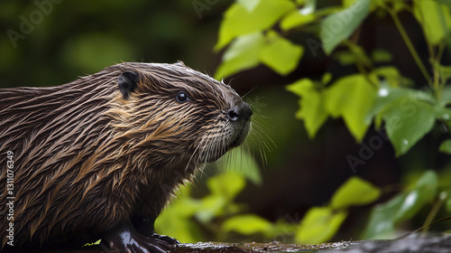 Beaver with damp fur in lush green forest setting