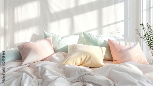 Bed with satin pillows in pastel colors and soft blankets on a white background.