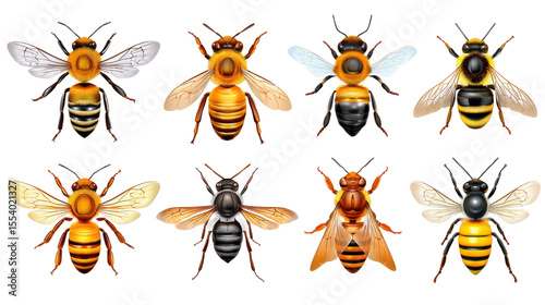 Bee Collection: A vibrant collection of intricately detailed honey bees, showcasing their distinct markings, wings, and segments, perfect for any project related to nature, pollination.