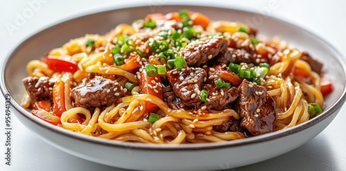 Beef and Vegetable Noodles with Sesame Seeds and Green Onions