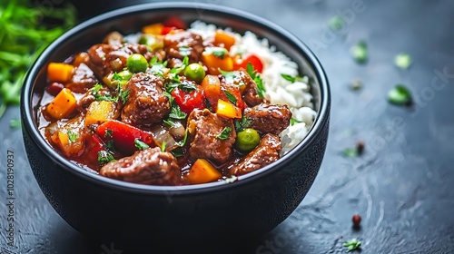 Beef and vegetables stir fry with white rice in a black bowl Grey background Close up : Generative AI
