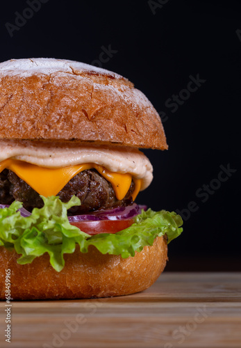 Beef burger with lettuce, tomato, cheddar cheese and onion