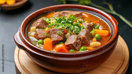 Beef hot pot with thinly sliced meat, vegetables, and broth boiling in a clay pot