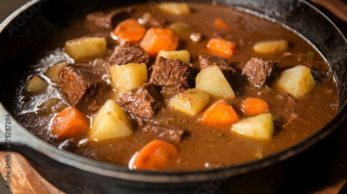 Beef stew in cast iron skillet, rustic kitchen setting.