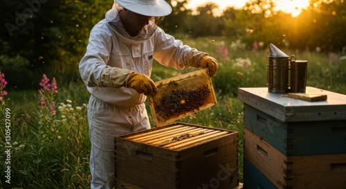 Beekeeper harvests honeycomb at sunset