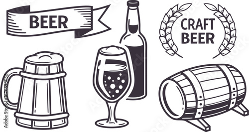 Beer sketch set. Flat vector drink is sitting in glass with ice, citrus slices, garnishes on transparent background. a detailed vintage-style vector illustration of assorted cocktail and drink glasses