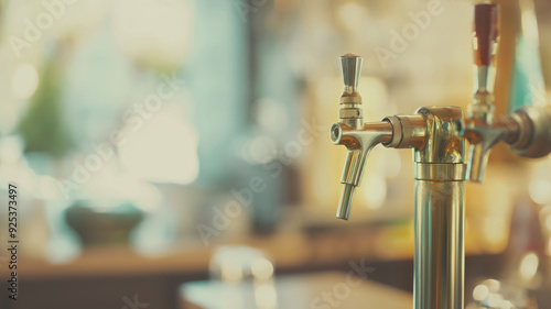 Beer tap in cozy pub with blurred background. Focus on brass tap and handle creating warm and inviting atmosphere