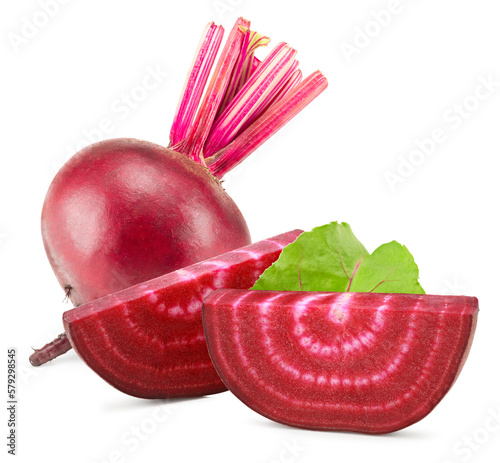 beetroot with pieces of beetroot and green leaf isolated on white background. clipping path