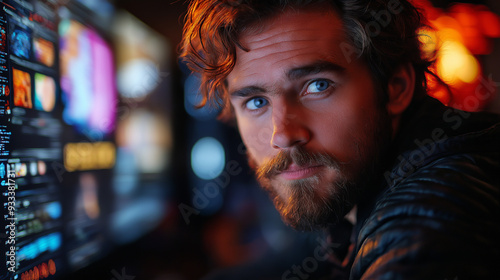 behind-the-scenes look at game development, including a designer working on a game interface or concept art, to illustrate the creative process behind gaming
