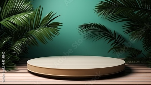 Beige background for product presentation with shadow of tropical palm leaves and light. Neural network ai generated art