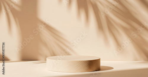Beige cylindrical podium on a neutral background with soft plant shadows, designed for product display, creating a minimalist studio scene with subtle refined aesthetic.