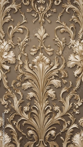 Beige ornate floral seamless pattern. Repeating decorative plant element design on brown background. Antique style background with flowing leaf shapes.