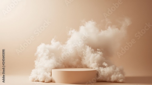 Beige podium with wispy clouds; product display; soft lighting; minimal design; 3d render; suitable for presentation; backdrop; promotional material