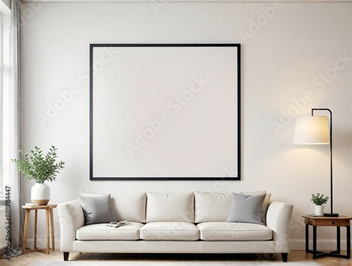 Beige sofa large blank framed poster mockup, and plants, natural light background, home decor concept. 3D Rendering