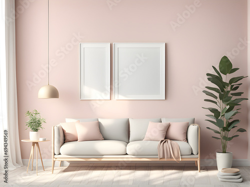 Beige velvet sofa with terra cotta cushions between houseplants. Mockup frame in interior background, room in light pastel colors, 3d render