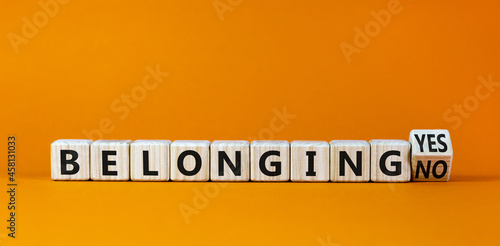 Belonging yes or no symbol. Turned a wooden cube and changed words 'belonging no' to 'belonging yes'. Beautiful orange background. Business and belonging yes or no concept, copy space.