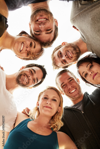Below, friends and huddle together in portrait for reunion by beach on holiday, vacation or break. Group of people, gathering and having fun for summer season, wellness or outdoor adventure in Greece