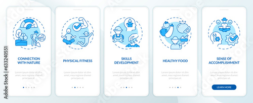 Benefits of farm work blue onboarding mobile app screen. Walkthrough 5 steps editable graphic instructions with linear concepts. UI, UX, GUI template. Myriad Pro-Bold, Regular fonts used