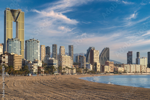 Benidorm skyline and sandy beach view.. Spain