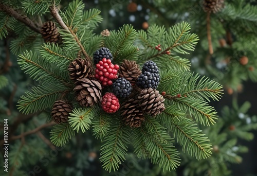 Berries and pinecones intertwined on a evergreen branch, evergreen branches, festive decor