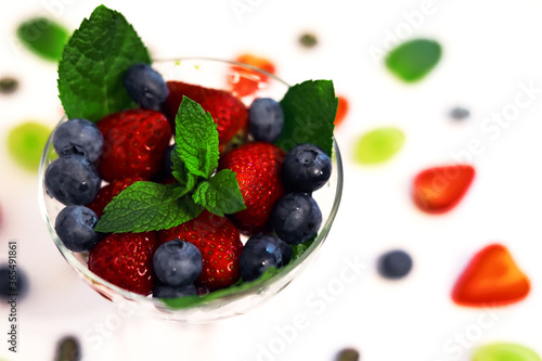 berry cocktail in a crystal glass with strawberries, blueberries, blueberries and mint close-up