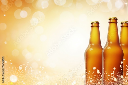 beverage frame background with three bottles of beer on bright brown background