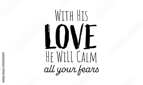 Biblical Phrase, With His Love He will calm all your fears, Christian typography for banner, poster, photo overlay, apparel design