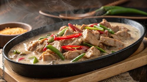 Bicol express served on a sizzling plate with fresh vegetables and toppings in a vibrant restaurant setting