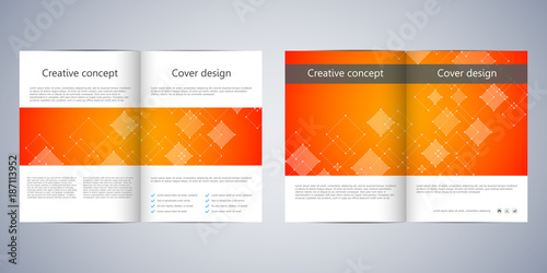 Bi-fold business brochure template with abstract background. Geometric graphics and connected lines with dots. Medical, technological and scientific concept. Vector illustration.