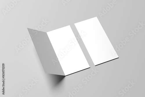 bi-fold or half-fold DL brochure mockup isolated on a soft gray background. 3D rendering illustration.