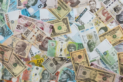 Big amount of money bills of different currencies and countries. Assortment background