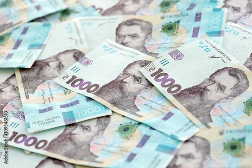 Big amount of ukrainian new one hundred hryvnia money bills with modern design. Financial concept, business