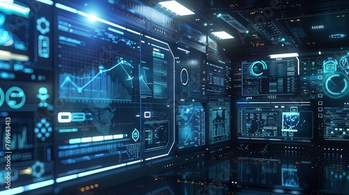 Big Data Analysis: A huge set of data is displayed on a computer screen or as a hologram.