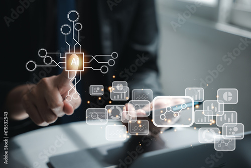 Big data analytics and dashboard interface for business transformation. Person using a touch screen for performance management. Smart industry and cloud computing technology on display.