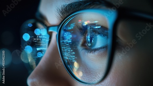 Big data Computer programmer reflected glasses on woman's face. AI generated images