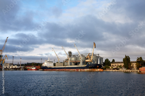 Big grain terminal at seaport. Cereals bulk transshipment from road transport to vessel. Loading grain crops on ship from large elevators at the berth. Transrportation of agricultural products.
