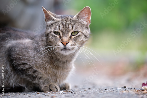 Big gray stray cat resting on steet outdoors in summer