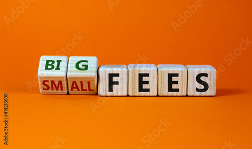 Big or small fees symbol. Turned wooden cubes and changed words 'small fees' to 'big fees'. Beautiful orange table, orange background, copy space. Business and big or small fees concept.