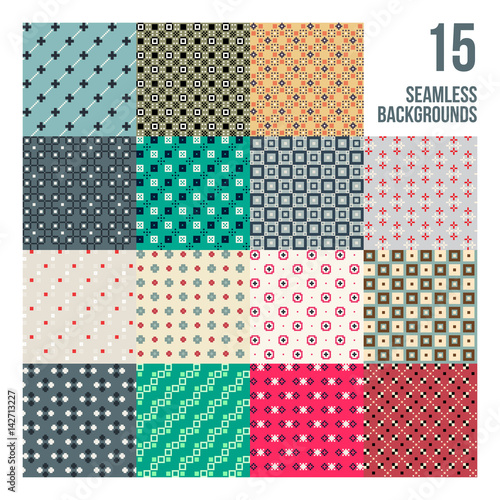Big set of 16 colorful pixelated patterns. Childish style. Useful for wrapping and textile design.