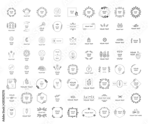 Big set of wedding branding frames and templates. Floral borders, elegant wreaths. Vector isolated illustration.