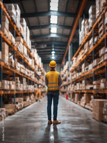 Big warehouse with rows of shelves with full of ware, worker in the middle
