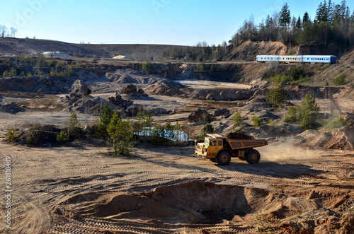 Big yellow mining truck transporting sand in an open-pit mining quarry, top view - image
