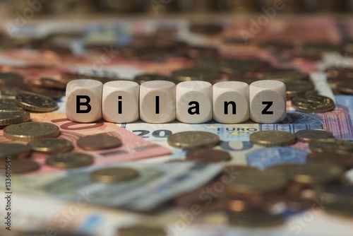bilanz - Holzwürfel mit Buchstaben im Hintergrund mit Geld, Geldscheine
