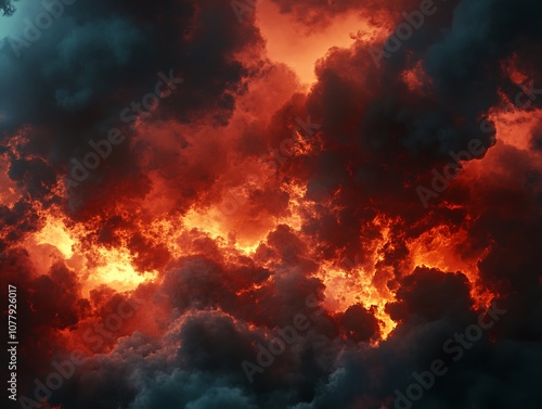 Billowing red and orange smoke clouds against a pitch-black background, creating a dramatic and abstract effect with intense contrast.