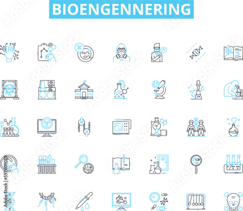 Bioengennering linear icons set. Biomaterials, Biomechanics, Bioprocessing, Bioreactors, Nanotechnology, Tissue engineering, Biocompatibility line vector and concept signs. Prosthetics,Bionics