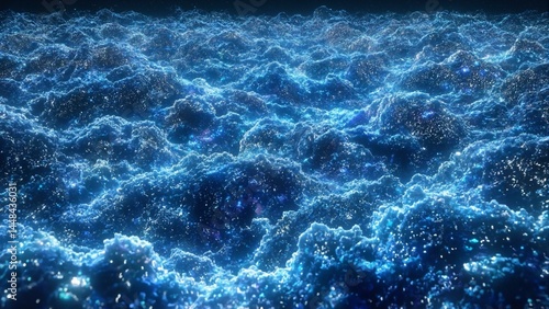 Bioluminescent coral reefs glow within an infinite ocean; shimmering glyphs pulse against cerulean waves.