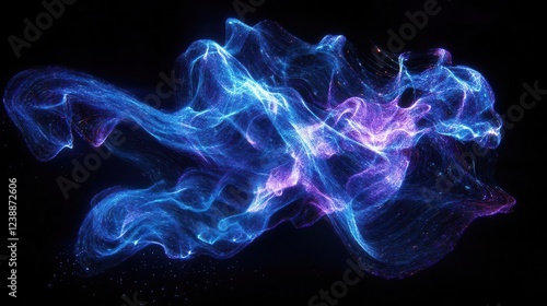 bioluminescent fiber optic cables forming abstract patterns, glowing with ethereal blues and purples against black background, creating intricate light trails and digital pathways